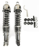 Shock Absorber Set - Chrome Body with Chrome Springs and End Cap - 365mm (14 3/8") Eye to Clevis. 4 Position spring preload adjustment, progressive wound heavy duty springs. Includes bushings, inserts, washers and spring preload wrench.
